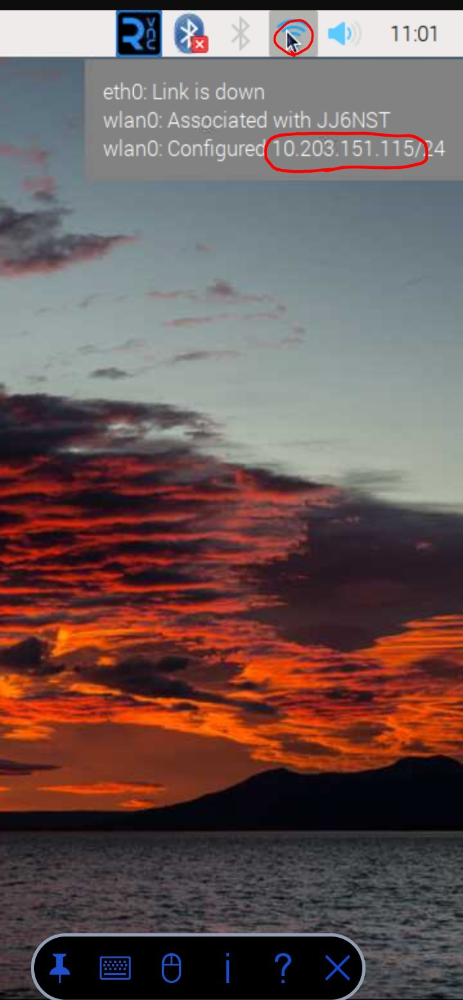 ラズパイの画面でワイヤレスLANのマークにポインターを合わせると確認出来ます。